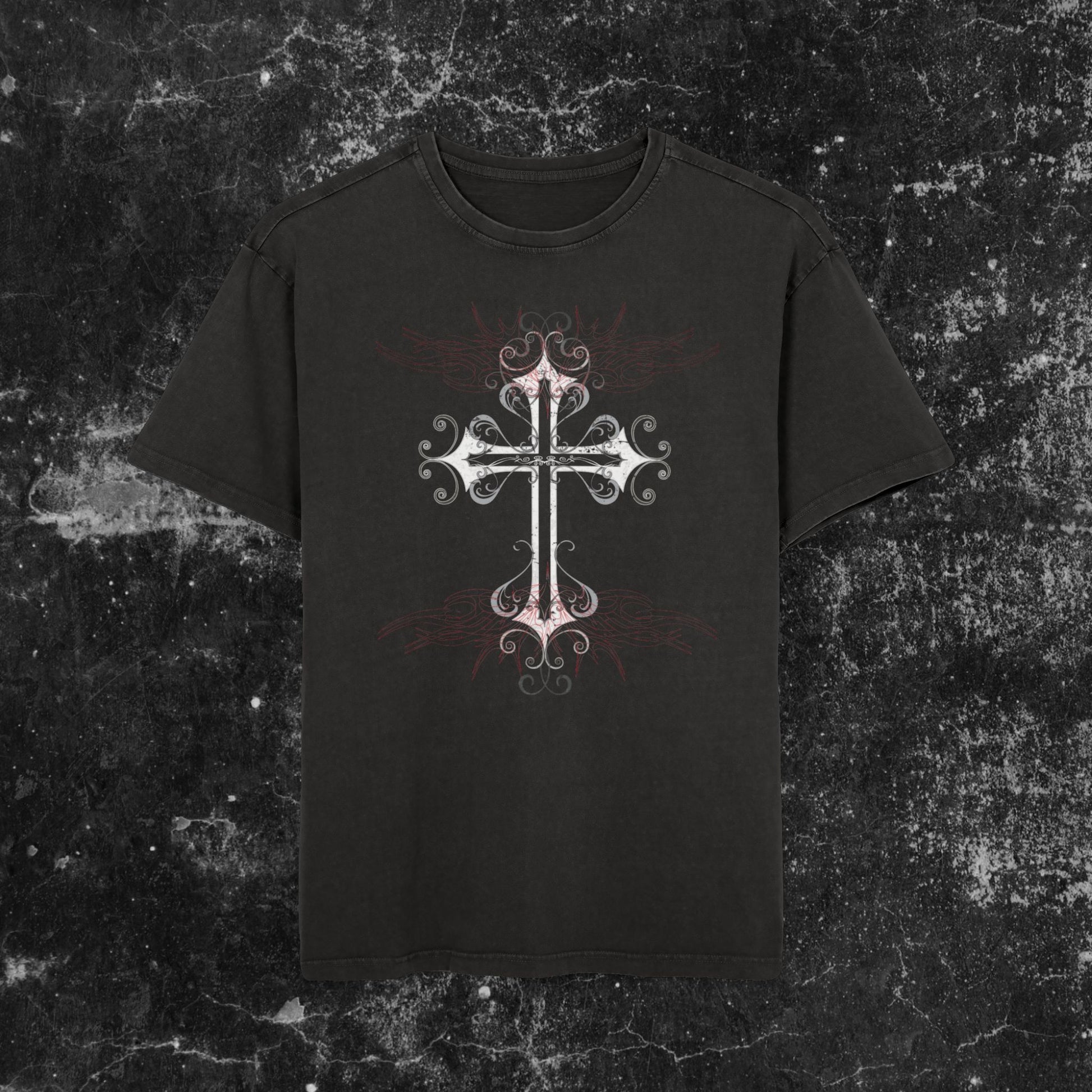 Unisex Acid Washed Oversized Tee with Cross Design, Grunge Style T-Shirt for Concerts, Casual Outfits, Streetwear Fashion